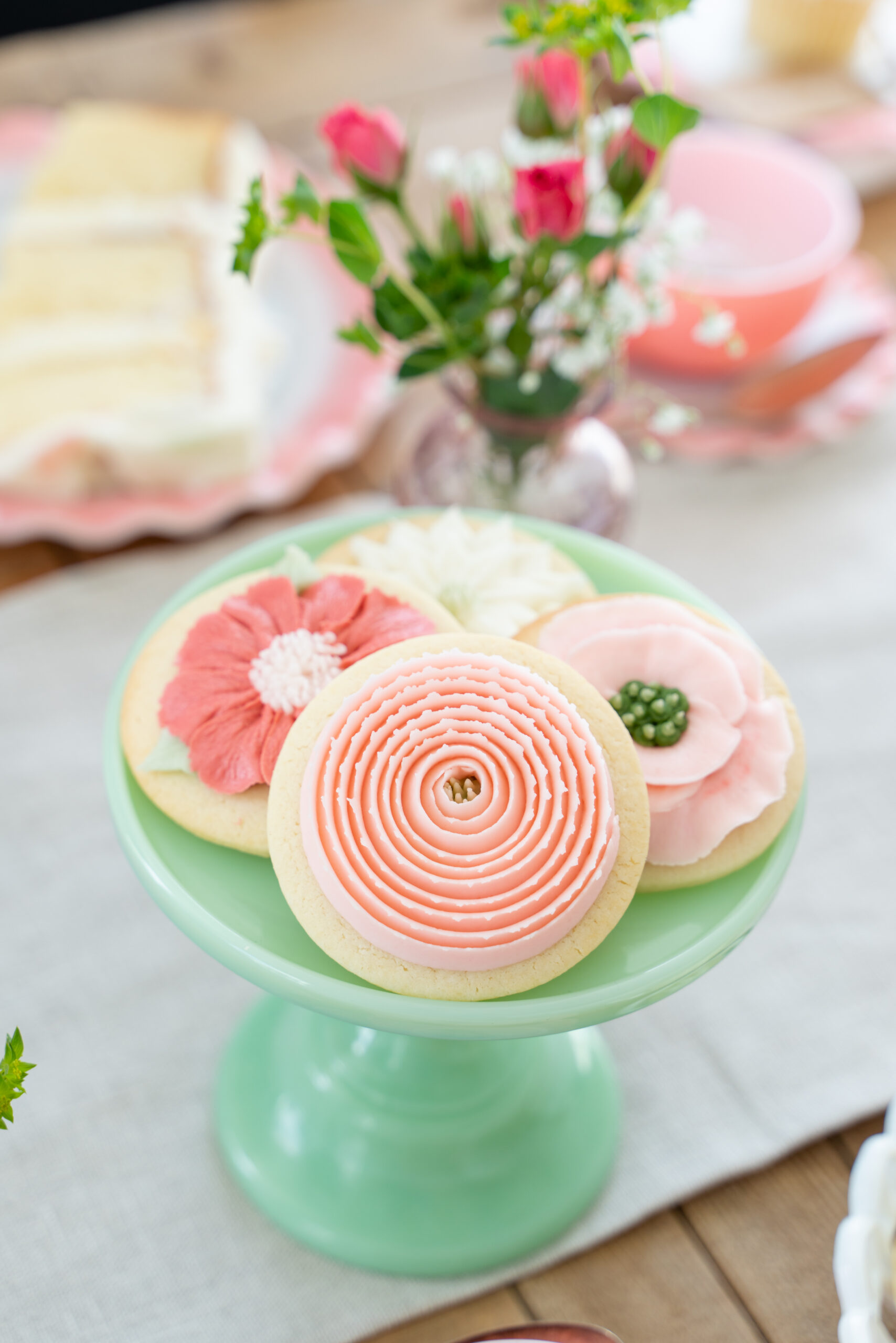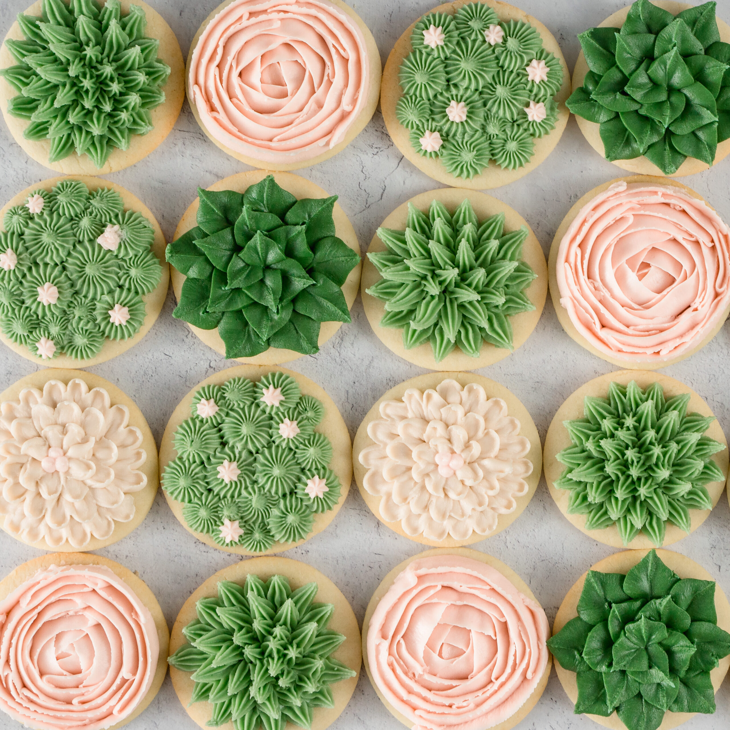 Using green buttercream, pipe small succulent shapes onto round cookies. I added soft pink tones alongside the greens to keep them feeling more “Mother’s Day” than overly earthy.