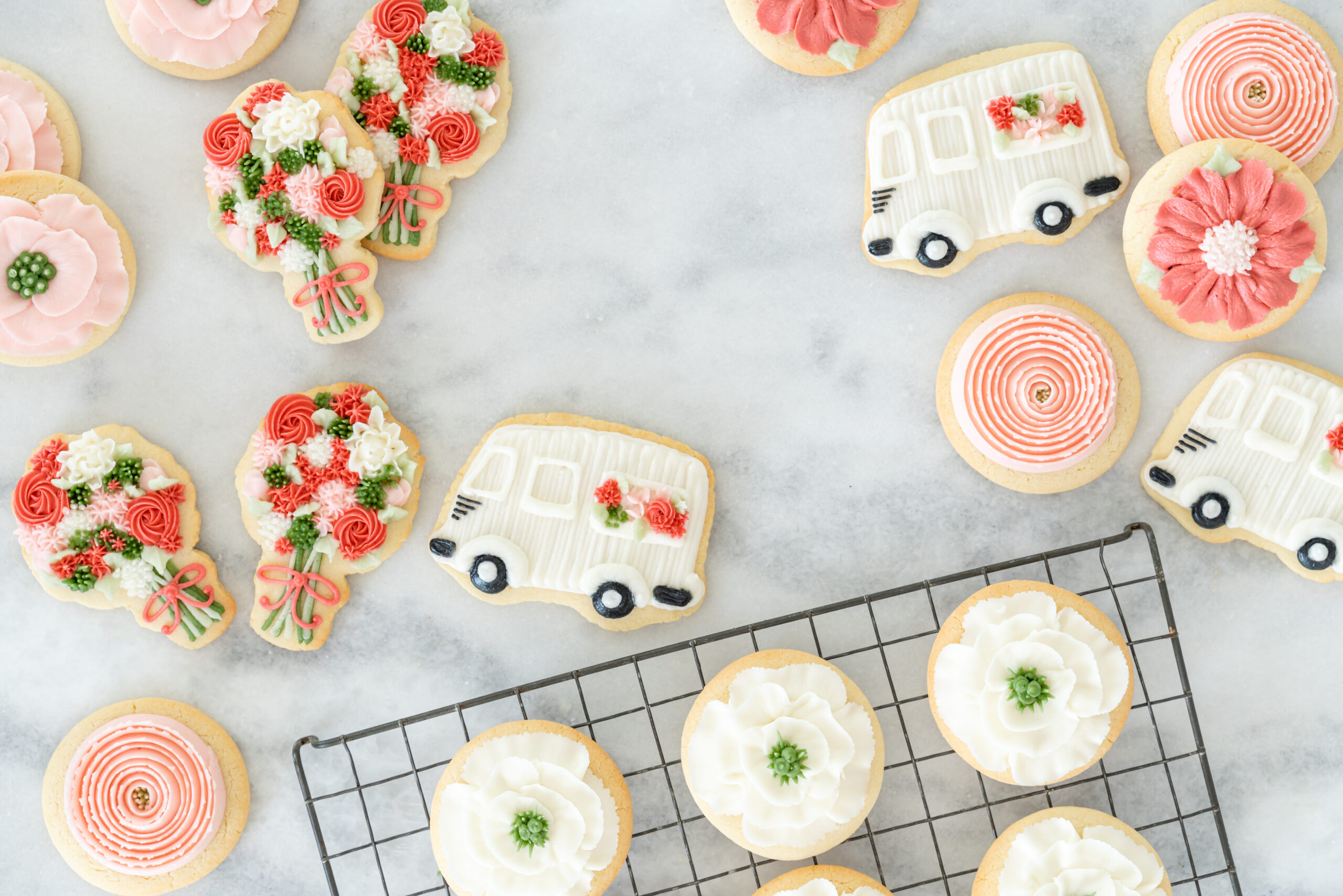 A simple white truck shape with flowers added into the window creates that soft, vintage feel. It’s a fun way to mix a themed cookie in with more classic florals.