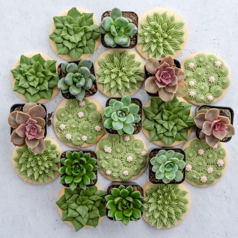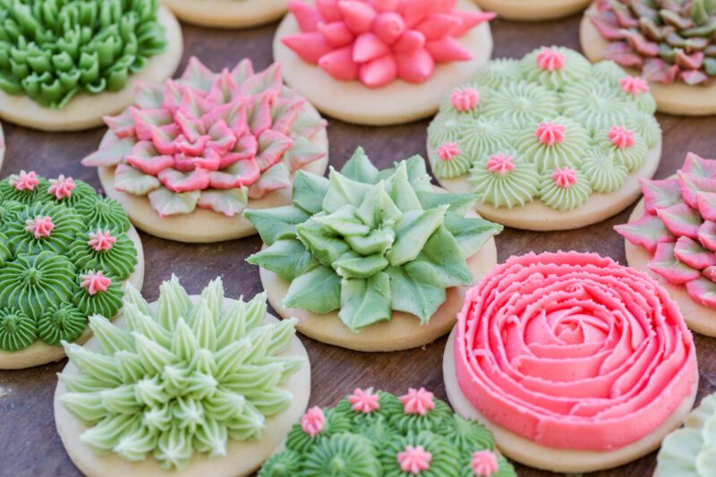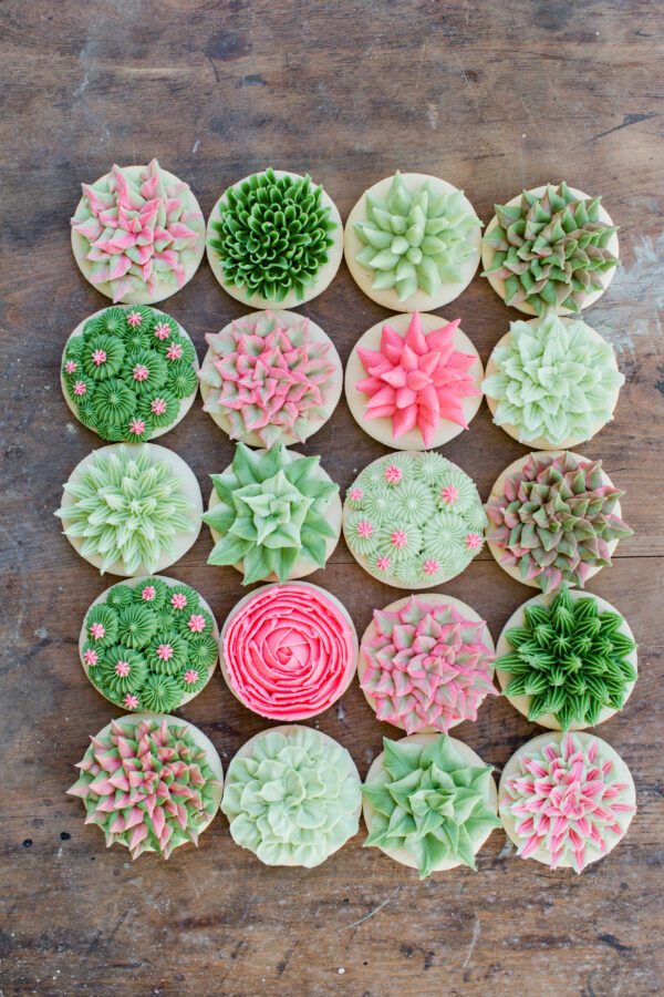 One of the easiest ways to create succulent inspired desserts is with round sugar cookies decorated using buttercream.
