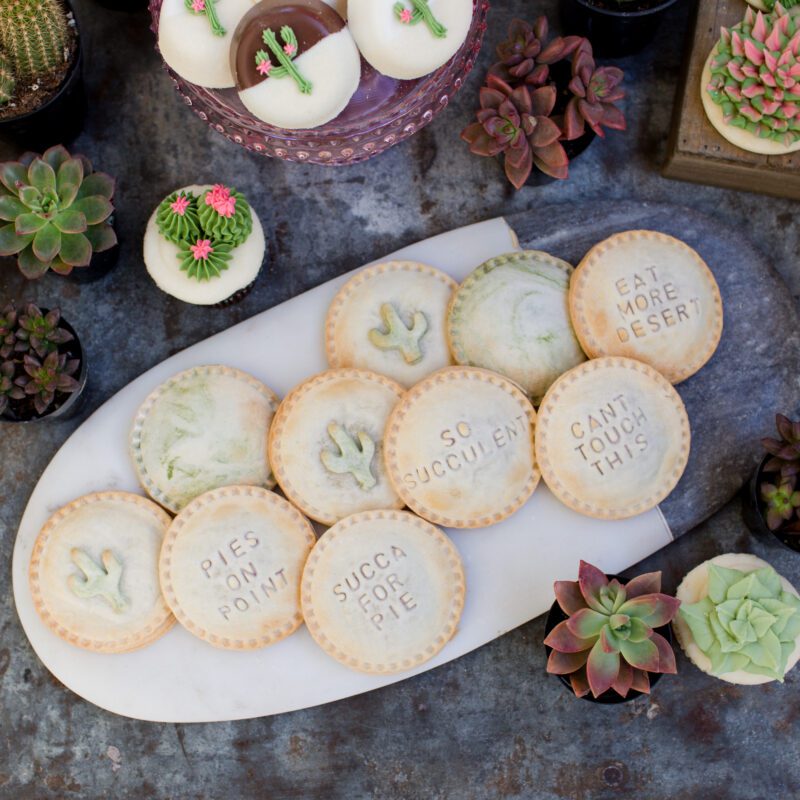 These small round pie cookies can be filled with fruit like apple strawberry, then topped with a pie crust cactus decoration and a light glaze for shine. They add warmth and texture to the dessert table and break up the buttercream-heavy items with something rustic.